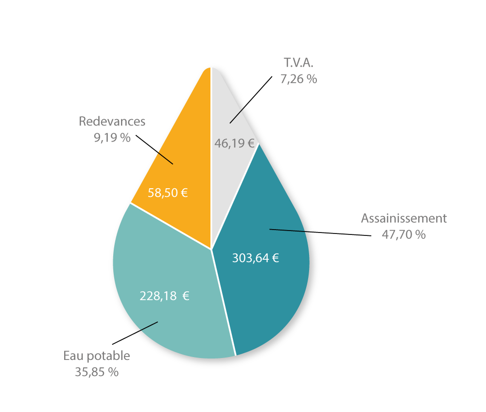 Le dernier composant du prix de l’eau est la Taxe sur la Valeur Ajoutée. Un taux de 5.5 % est appliqué sur les prestations relevant de l’eau potable. Les prestations « assainissement » sont quant à elles assujetties à un taux de 10 %.
